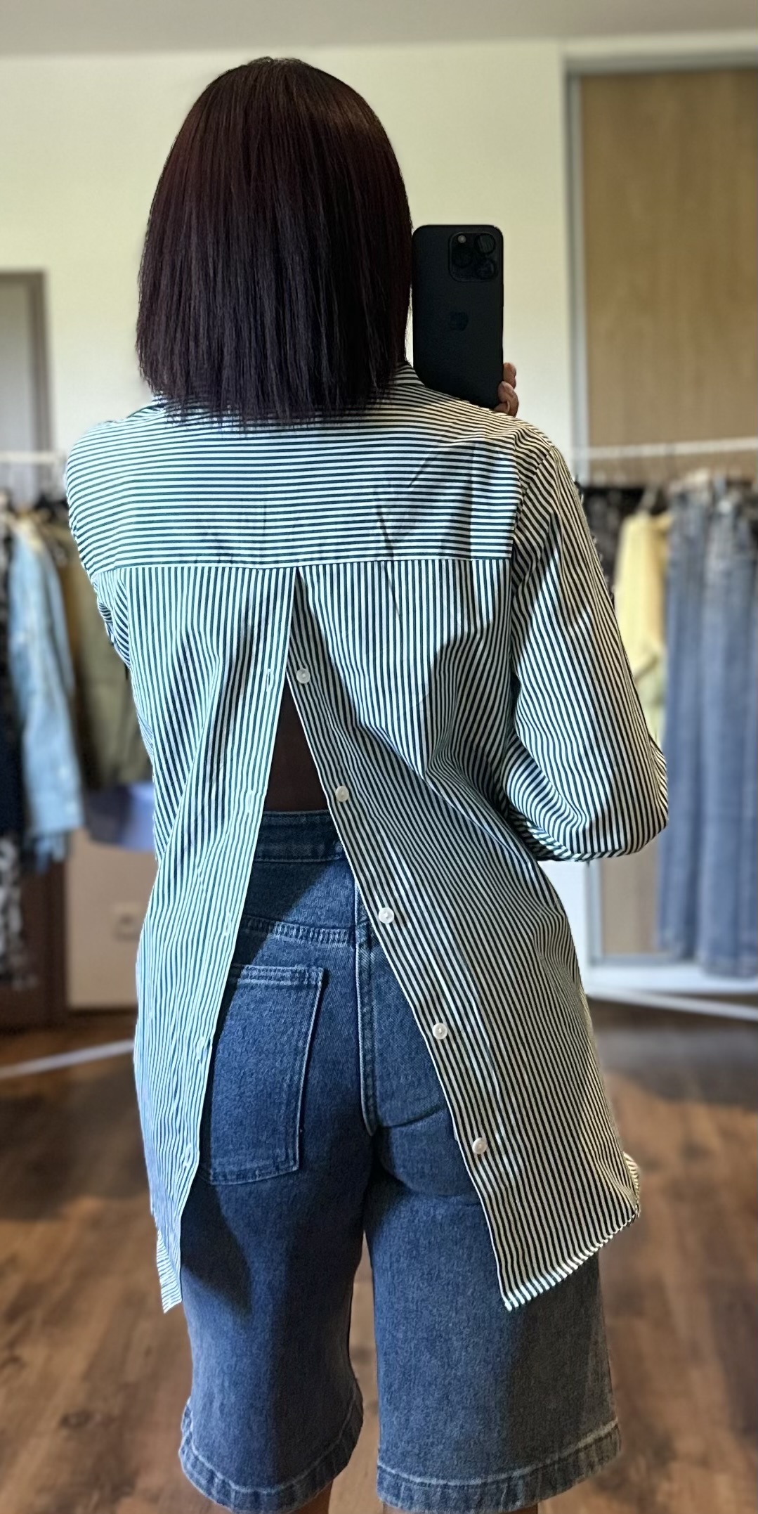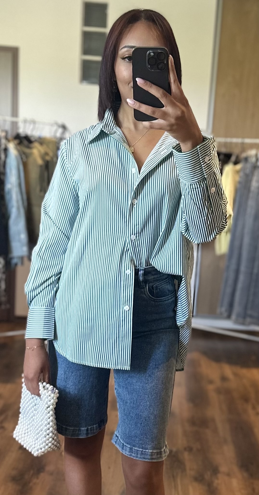 Cette chemise verte à fines rayures blanches séduit par sa coupe fluide et légèrement oversize, idéale pour un look chic sans effort.
