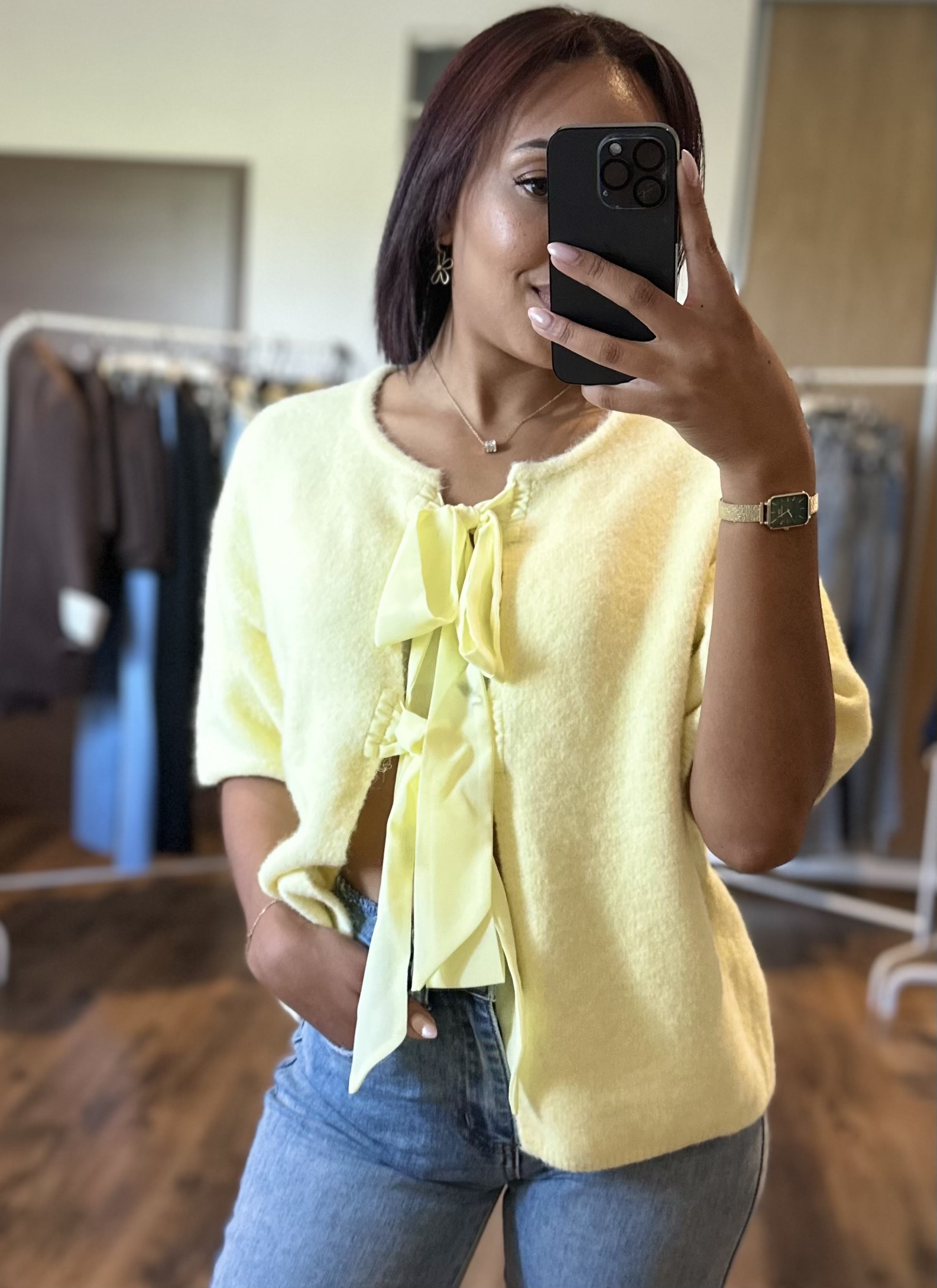 Pull doux en maille duveteuse, coloris jaune pastel lumineux. Son col rond est sublimé par un large nœud en ruban ton sur ton, qui apporte une touche féminine et raffinée. Sa coupe légèrement ample et ses manches courtes offrent un confort absolu et un look chic décontracté. À porter aussi bien avec un jean casual qu’une jupe pour un style frais et moderne.